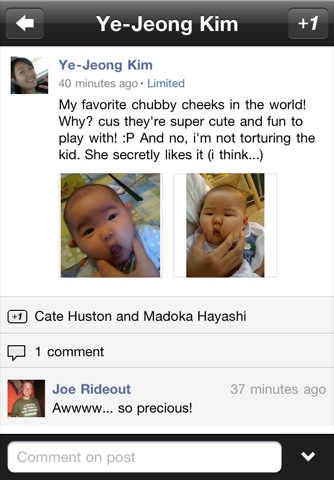 Google+ for mobile makes sharing the right things with the right people a lot simpler. Huddle lets you send super-fast messages to the people you care about most. And no matter where you are, the stream lets you stay in the loop about what your friends are sharing and where they’re checking in.