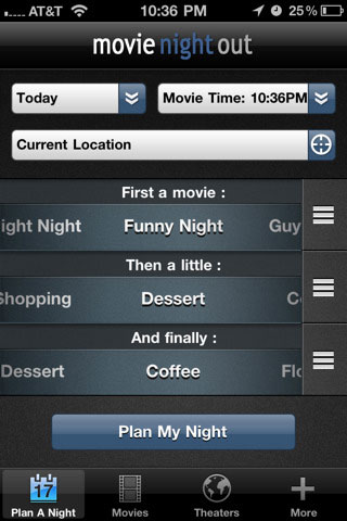 Movie Night Out [iTunes link] is a free app for the iPhone and Android (Android) that is designed to help answer the question, “what do you want to do tonight?” The app is pretty ingenious because it not only helps you find movies playing in your area, but also find places to eat or grab coffee after the flick.
