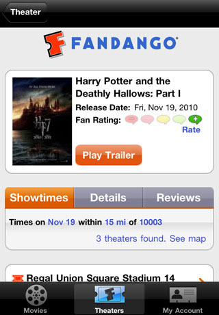 Fandango has a free app for iPhone [iTunes link] and Android, while MovieTickets.com has an unofficial (and beautifully executed) app by way of Movies Now HD [iTunes link].