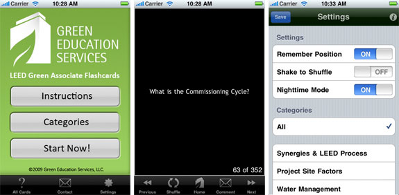 Introducing the LEED Green Associate apps for iphone – the most convenient way to study for the LEED Green Associate Exam. Having already ushered thousands of satisfied Clients through the LEED Accreditation Process, Green Education Services knows what it takes to pass the LEED Exam…on the first try. This apps for iphone is a digital version of our printed flashcards that have received rave reviews from thousands of satisfied Clients.