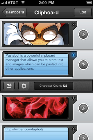 Pastebot is a powerful new clipboard manager that stores text and images copied from your iPhone/iPod Touch. Copy something you want to save, run Pastebot and it automatically gets imported for you to access later.